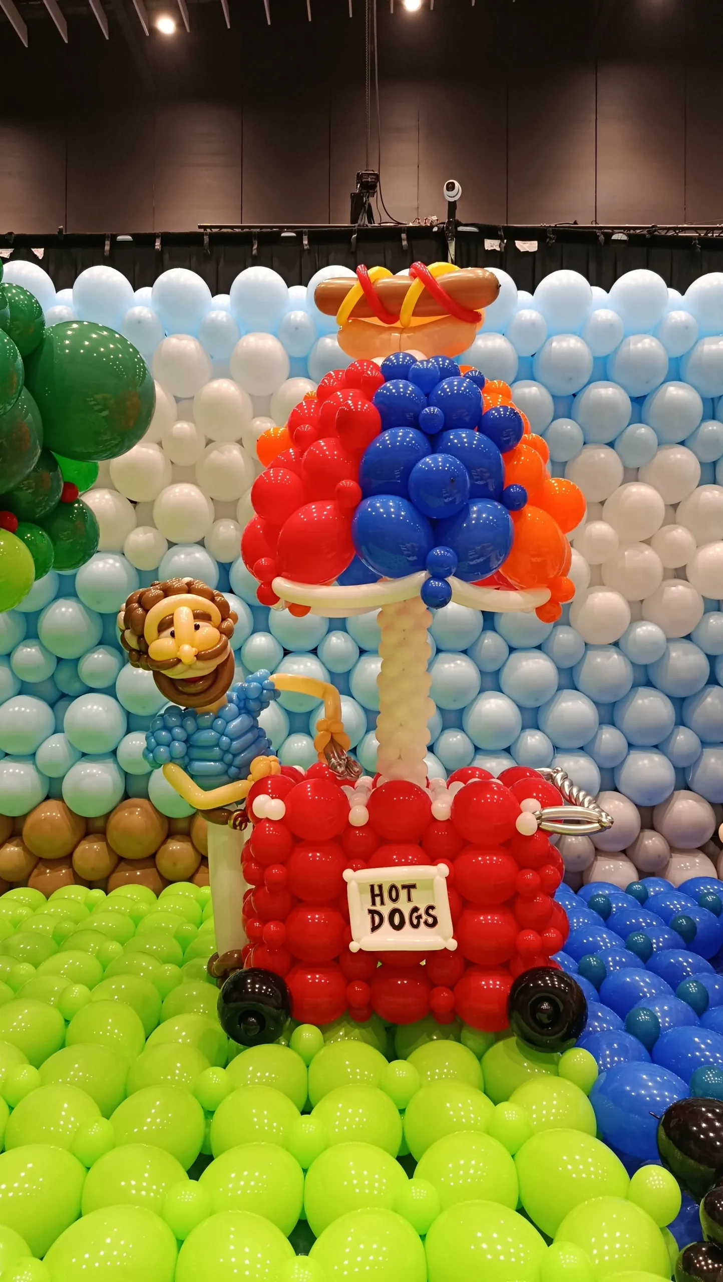 מיצג בלונים צבעוני ומלא חיים בדמות דוכן נקניקיות עם מוכר שמח וגג בלונים עשיר בצבעי אדום כחול וכתום. הדוכן מעוצב עד לפרטים הקטנים כולל שלט HOT DOGS גלגלים ואלמנטים שמדמים דוכן רחוב אמיתי.
