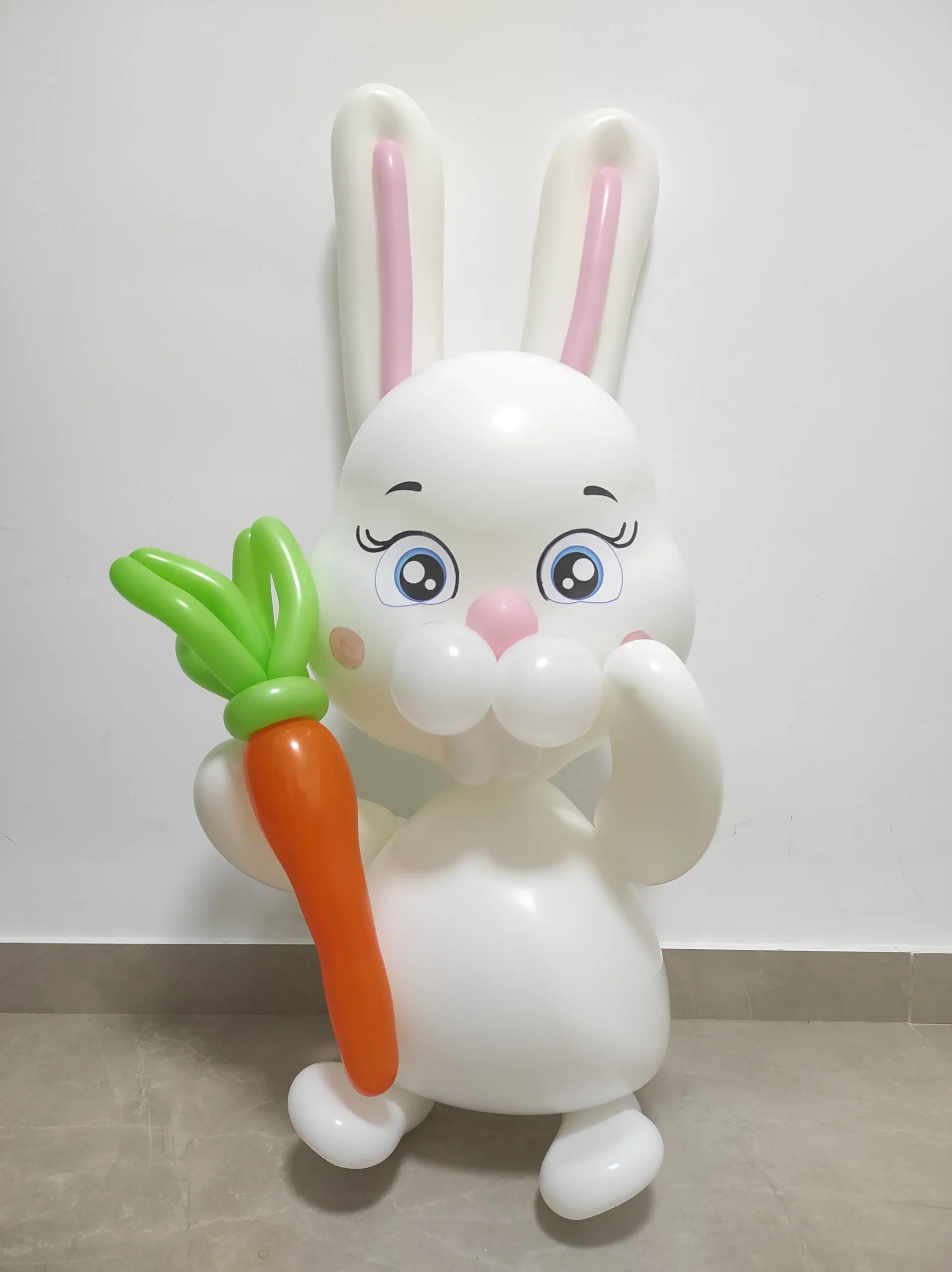 ארנב בלונים תלת ממדי הוא דמות חמודה וצבעונית שמתאימה לאירועי פסח ימי הולדת קונספט חיות ואירועי ילדים. העיצוב כולל ראש גדול עם הבעה מתוקה אוזניים גבוהות וגזר כתום ביד שמוסיף אופי ושובבות.