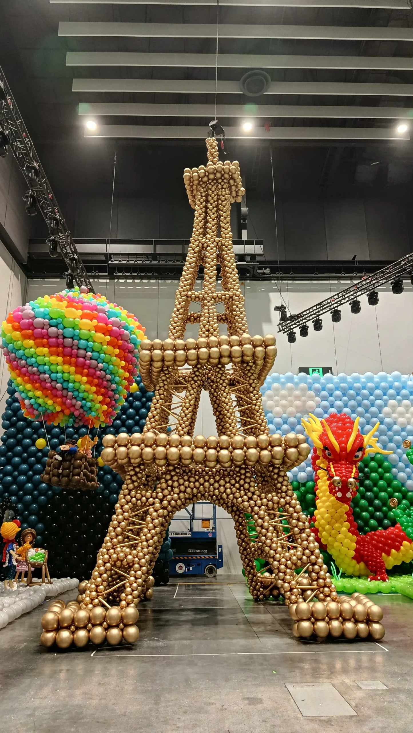 מיצג בלונים תלת ממדי עצום בהשראת מגדל אייקוני עולמי, בנוי מאלפי בלונים בגוון זהב מטאלי היוצרים מראה יוקרתי, מרשים וסימטרי במיוחד.