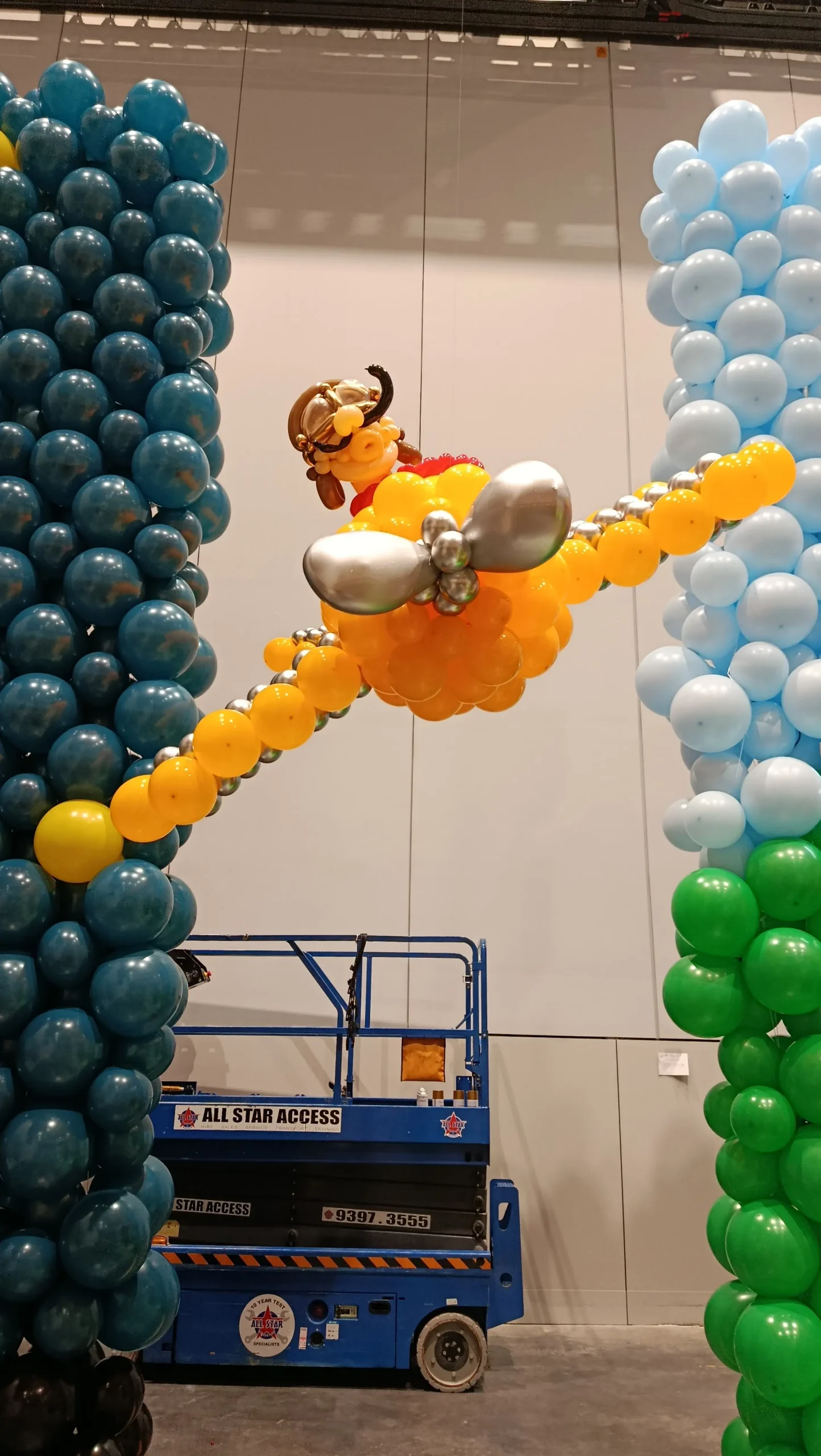 מיצג בלונים מרהיב בדמות מטוס תלת ממדי מרחף באוויר עם טייס חמוד בתא הנהג. העיצוב בנוי ממאות בלונים בגווני כתום צהוב וכסף עם פרופלור קדמי ליצירת מראה דינמי וחי. המטוס תלוי בין עמודי בלונים גבוהים ומייצר אפקט ריחוף אמיתי שמושך תשומת לב מכל כיוון.