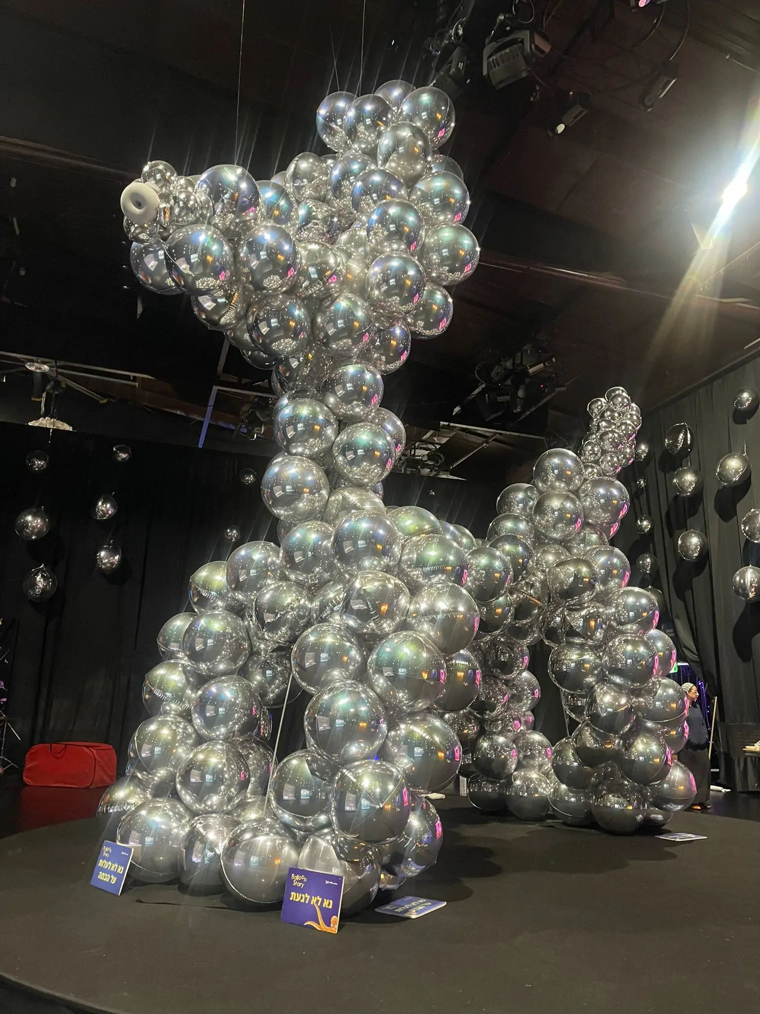 מיצג בלונים מרהיב בגימור כרום כסוף היוצר צורה פיסולית דרמטית בגובה מרשים.