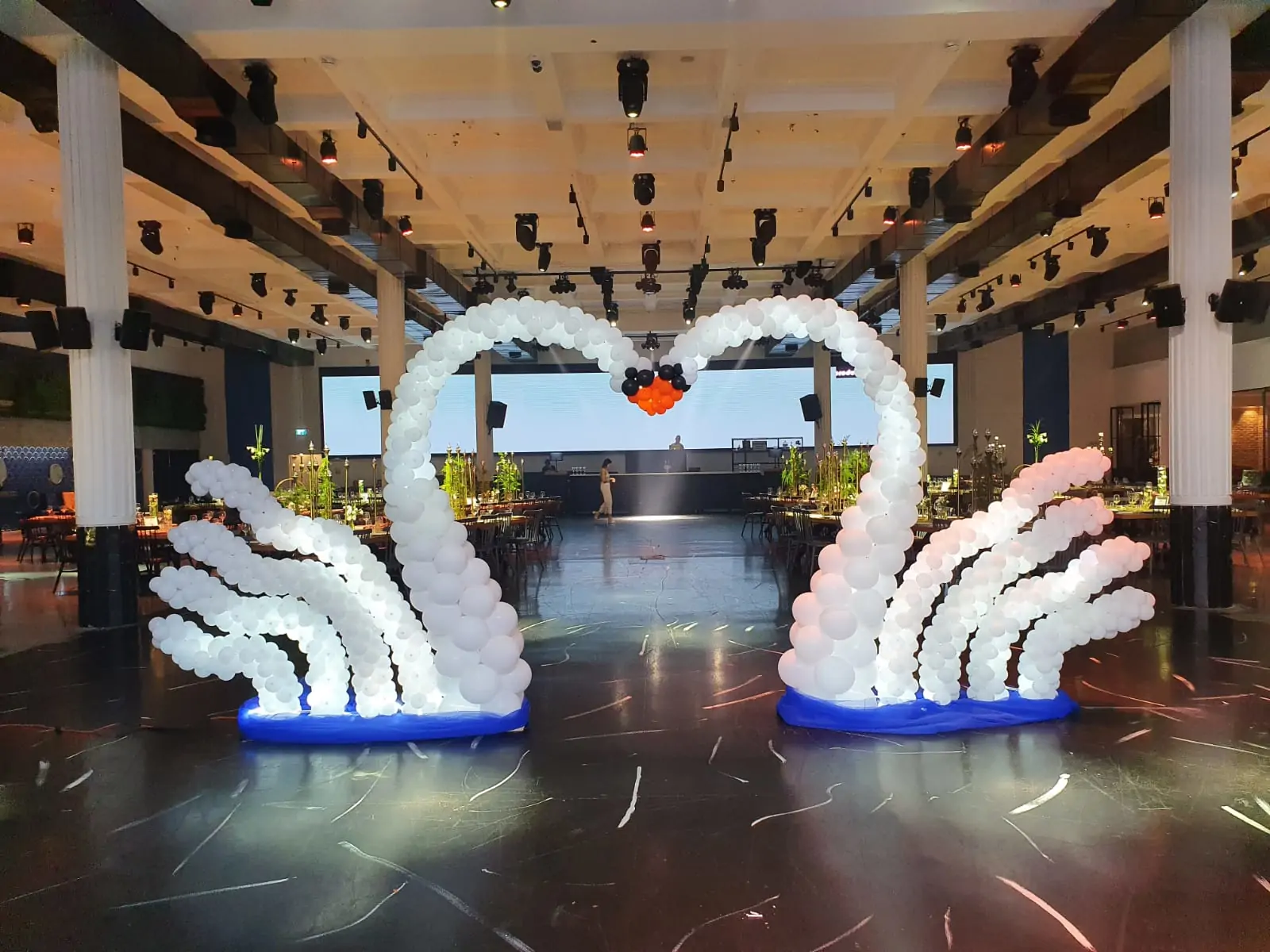 מיצג בלונים תלת ממדי בדמות שני ברבורים לבנים היוצרים יחד צורת לב מרשימה במרכז הרחבה.