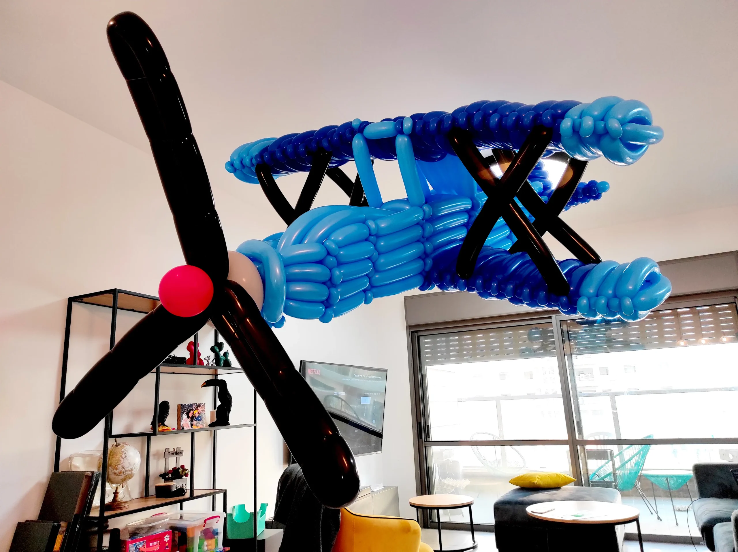 העיצוב בנוי ממאות בלוני צינור ובלונים עגולים המחוברים בקפידה ליצירת גוף מטוס מפורט, כנפיים רחבות ושלדת חיזוק המדמה מבנה אמיתי. המדחף השחור בחזית מוסיף דרמטיות ואפקט וואו מיידי לכל חלל.