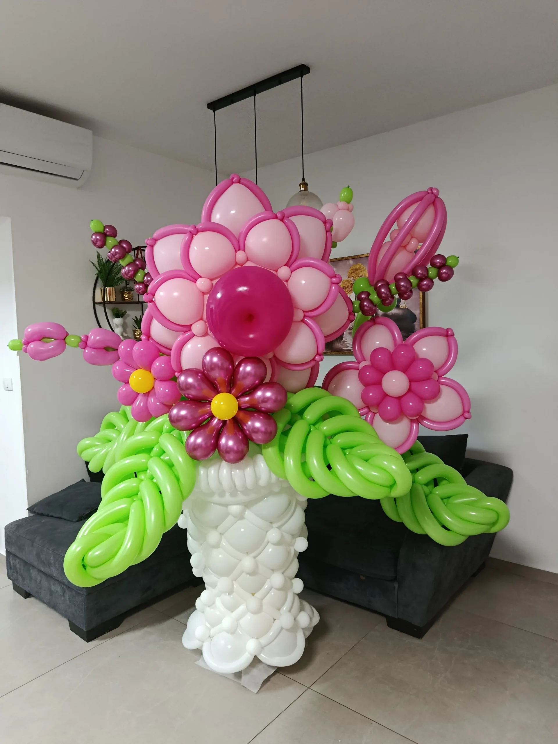מיצג בלונים מרהיב בדמות זר פרחים ענק בעיצוב עשיר ומלא נפח. הפרחים בנויים בשכבות מדויקות בגווני ורוד פוקסיה ולבן עם עלים ירוקים מפותלים שמעניקים תחושת תנועה וטבע אמיתי.