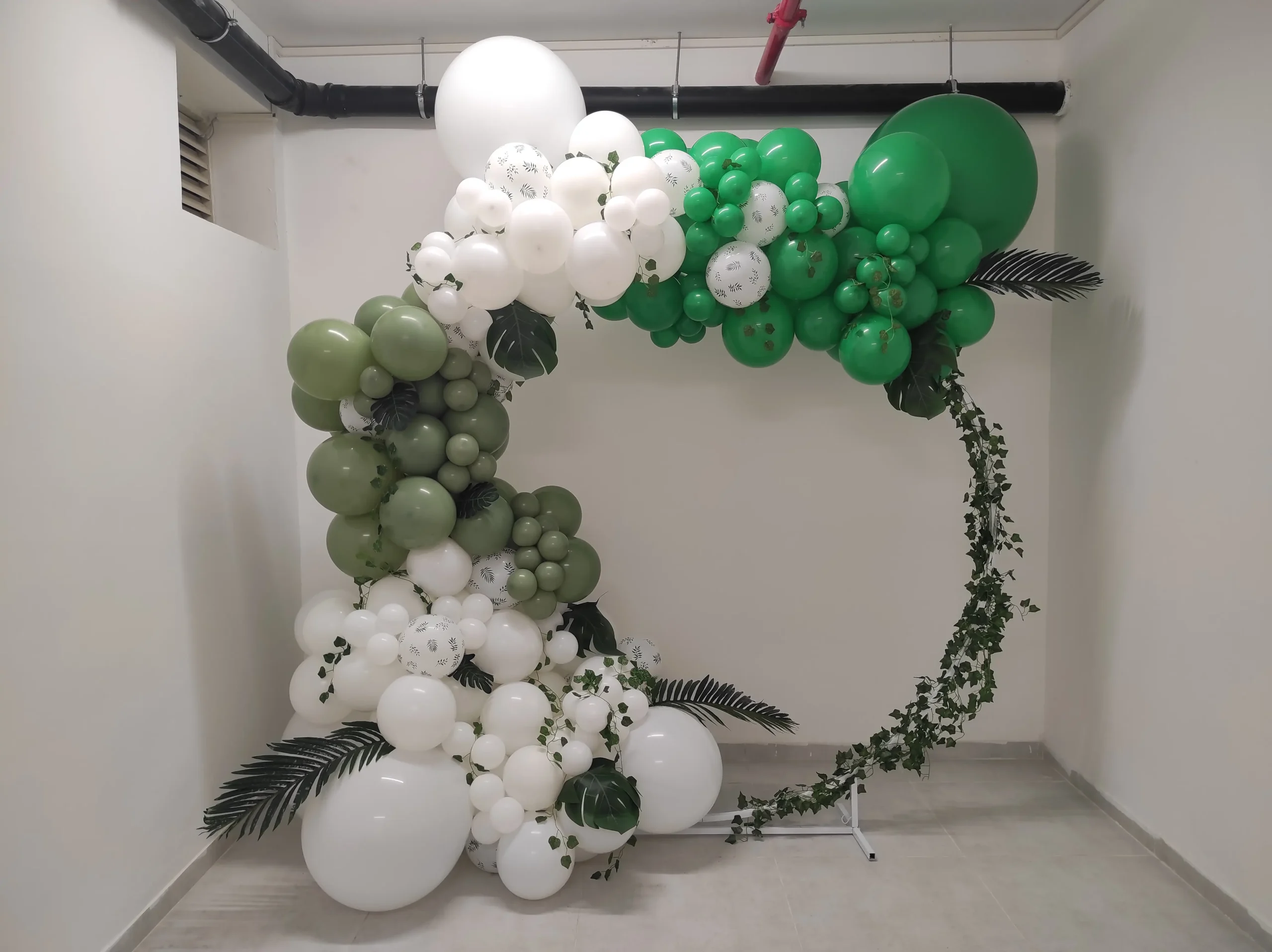קשת בלונים אורגנית ירוק לבן עם עלים