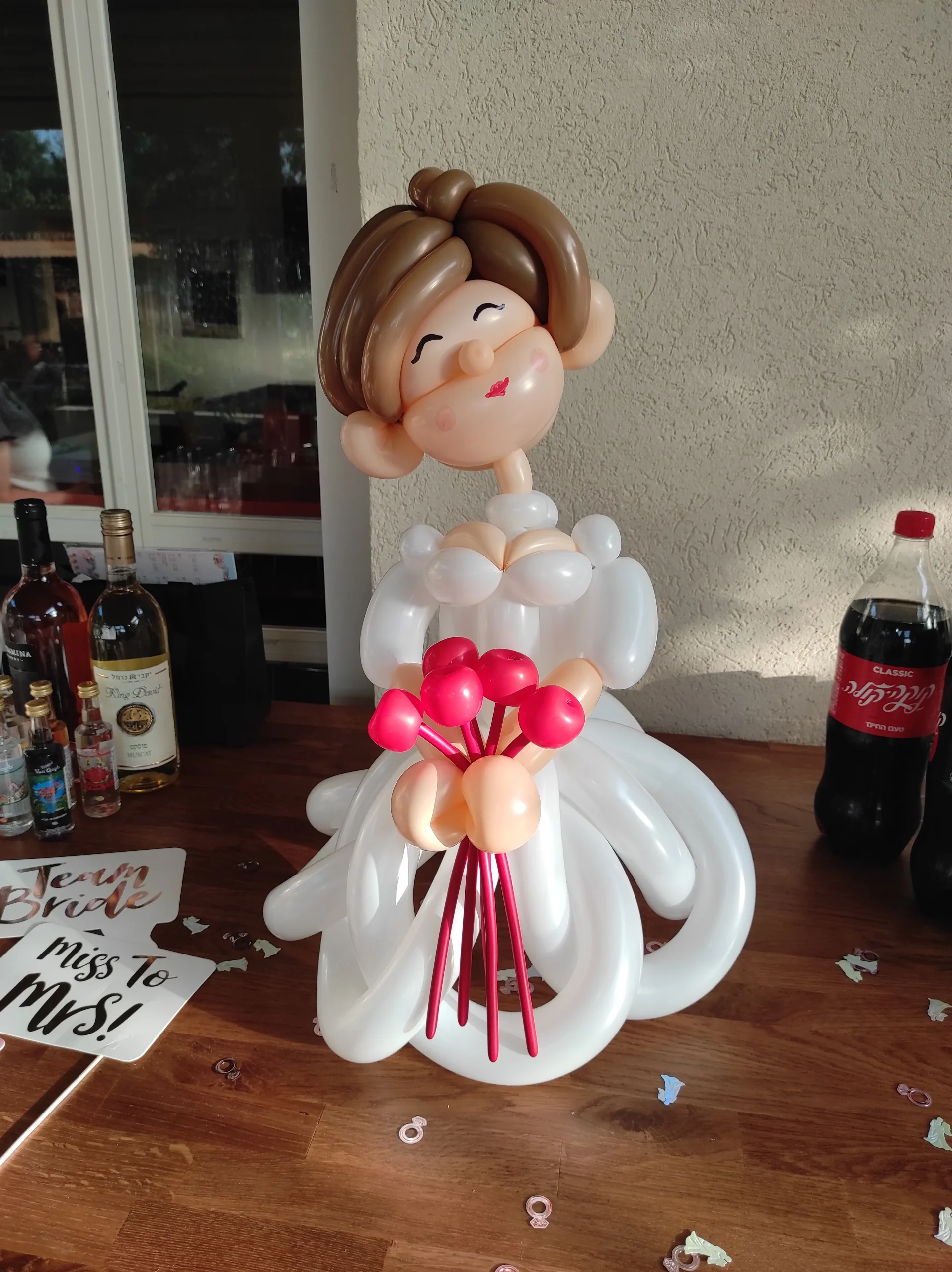 הבובה בנויה מבלונים בגוונים לבנים ובז’ עם עיצוב שיער מוקפד וזר פרחים אדום או בהתאמה אישית לפי צבעי האירוע. ניתן לשלב גם שם הכלה תאריך האירוע או מסר מיוחד.