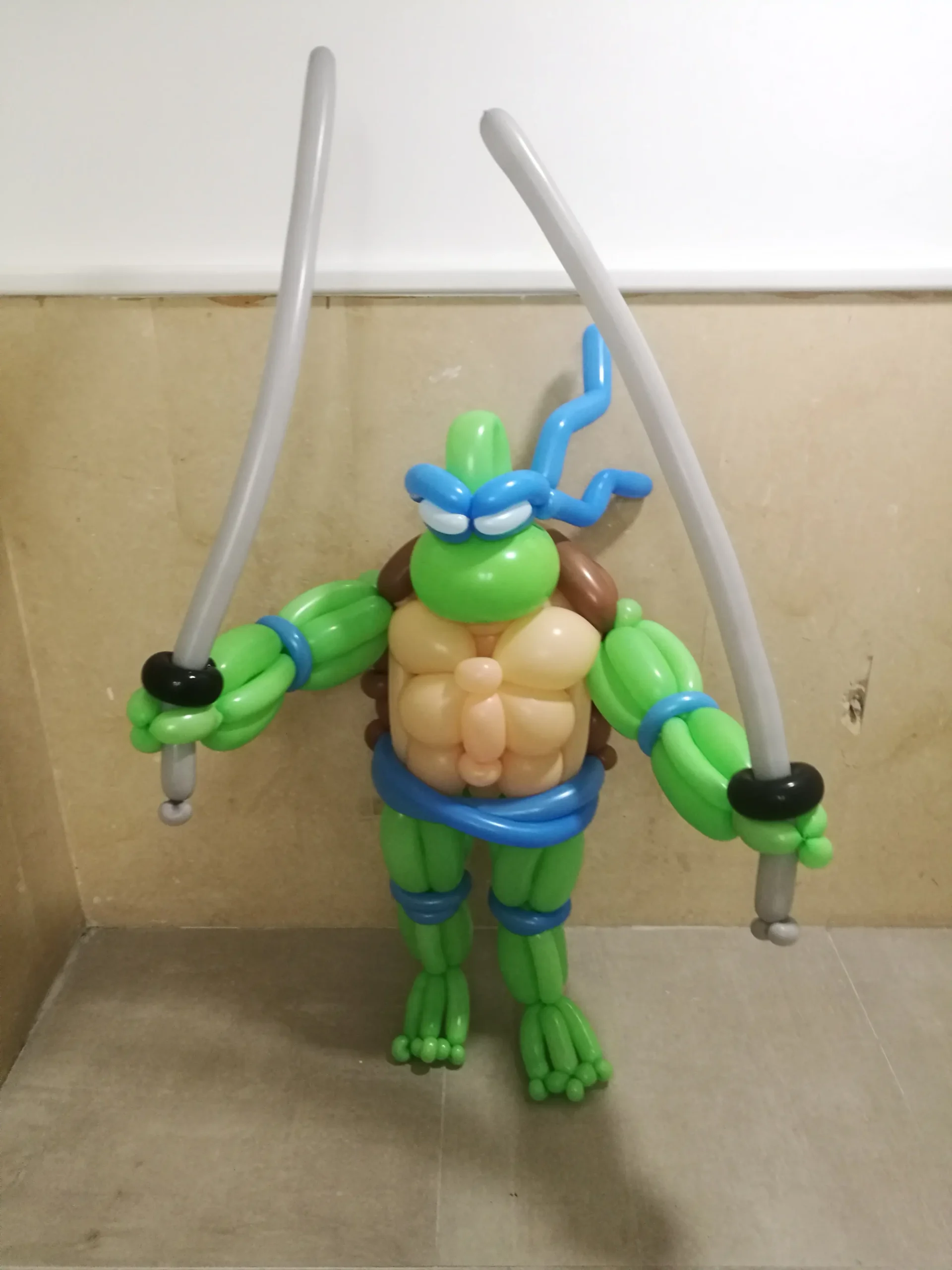 דמות בלונים צב נינגה היא פסל בלונים מרשים בהשראת לוחם נינג׳ה ירוק עם שריון וחרבות בידיים. הדמות בנויה בגובה מלא עם גוף שרירי מעוצב מבלונים ופרטים מדויקים כמו מסכה כחולה חרבות וכפות רגליים מודגשות.