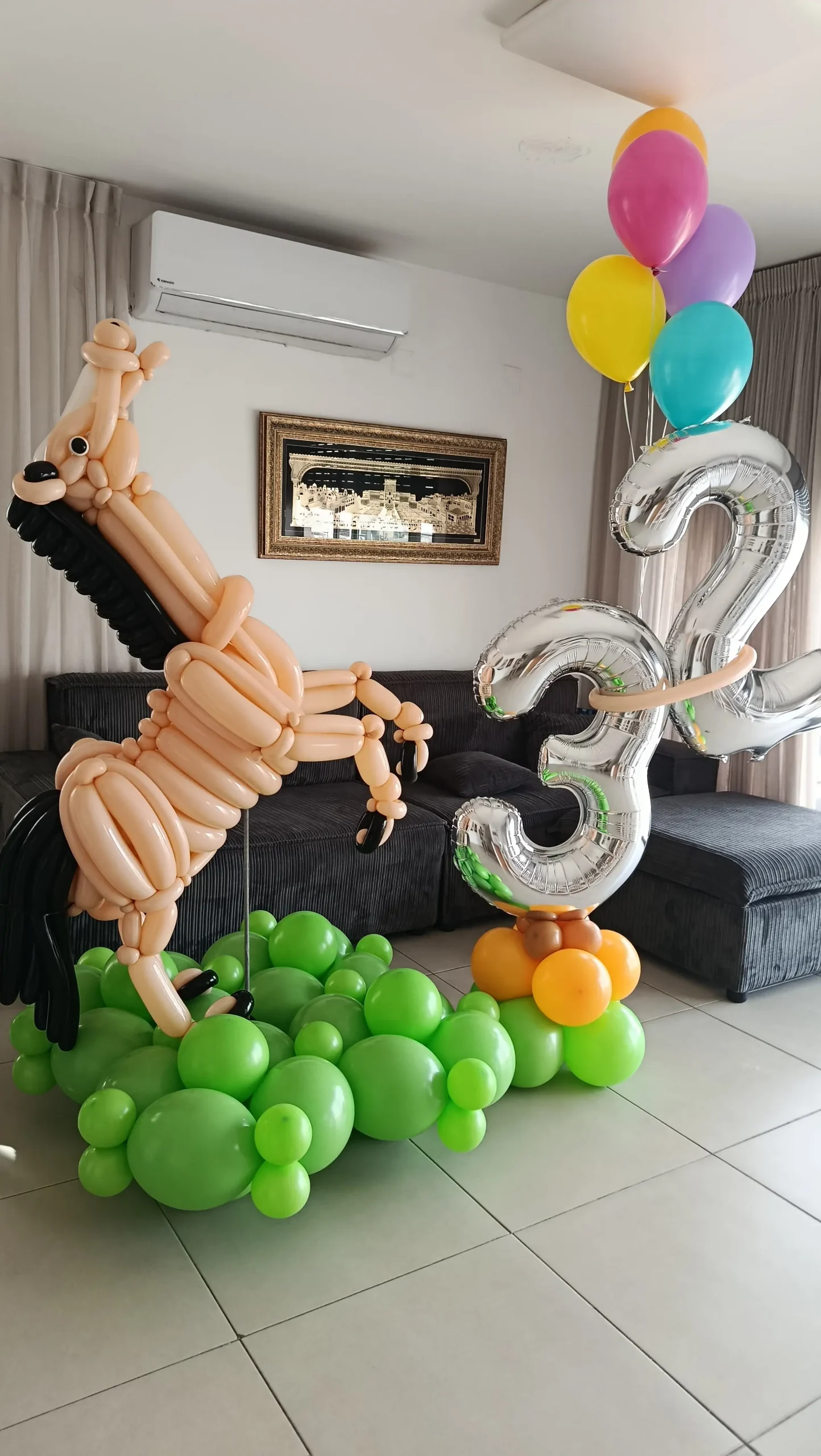 הסוס מעוצב בפרטים מדויקים המדמים רעמה, גוף ופרסות, ומוצב על בסיס בלונים ירוק היוצר תחושת טבע ותנועה. המספר הכסוף מעניק מראה חגיגי ובולט והופך את העיצוב למוקד מרכזי בצילומים.